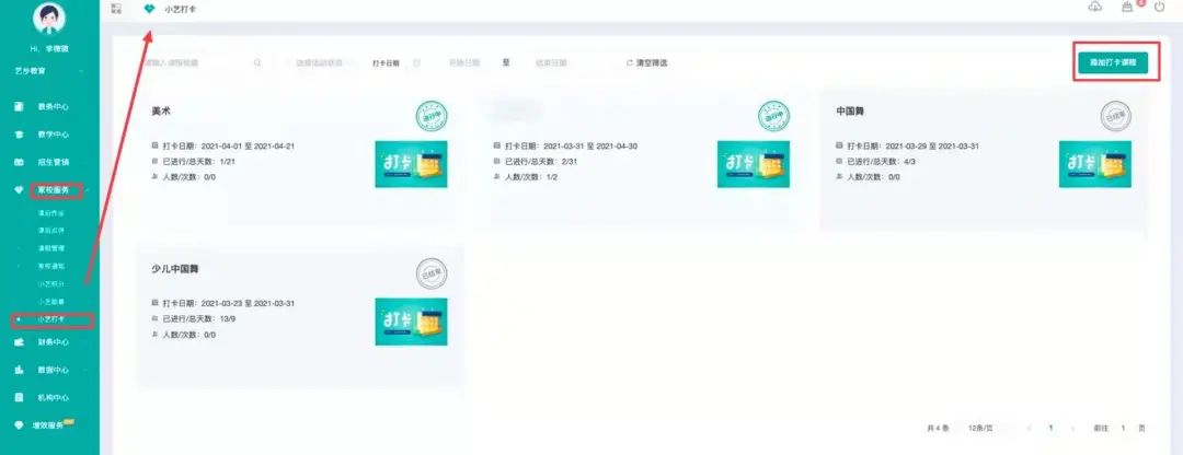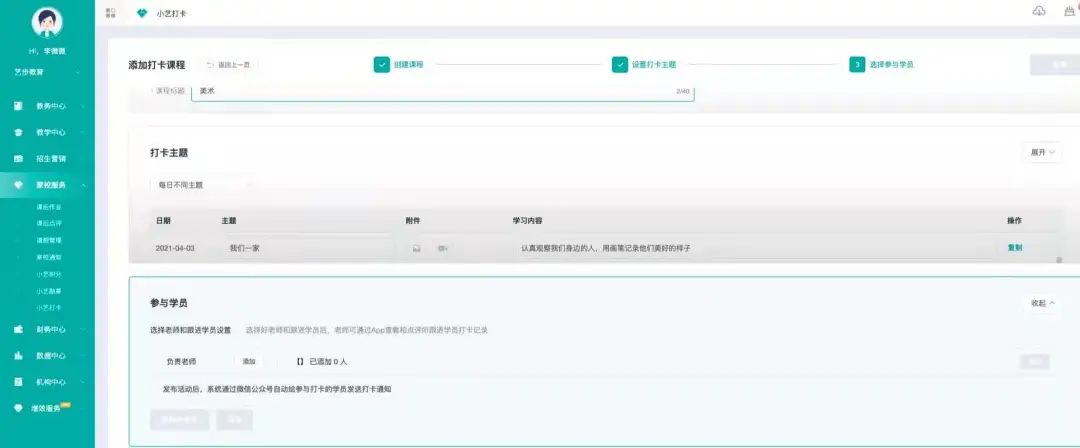 3、在“藝步管理系統-家校服務-小藝打卡”中設置一次打卡活動: