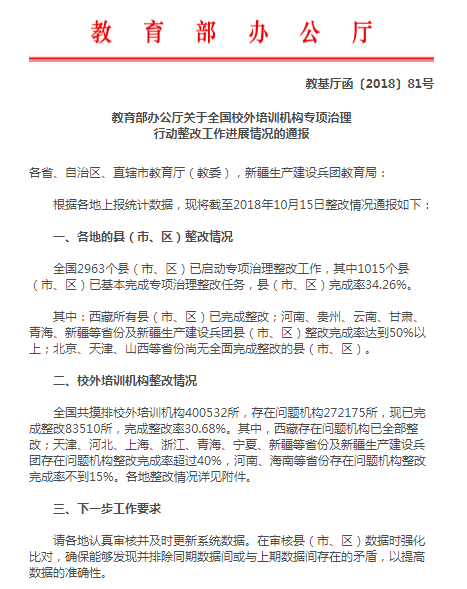 截至2018年10月15日,全國共摸排校外培訓機構400532所,存在問題機構272175所,現已完成整改83510所,完成整改率30.68%。
